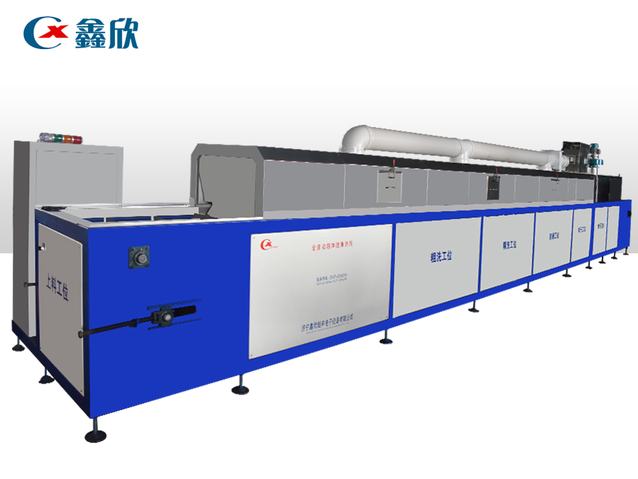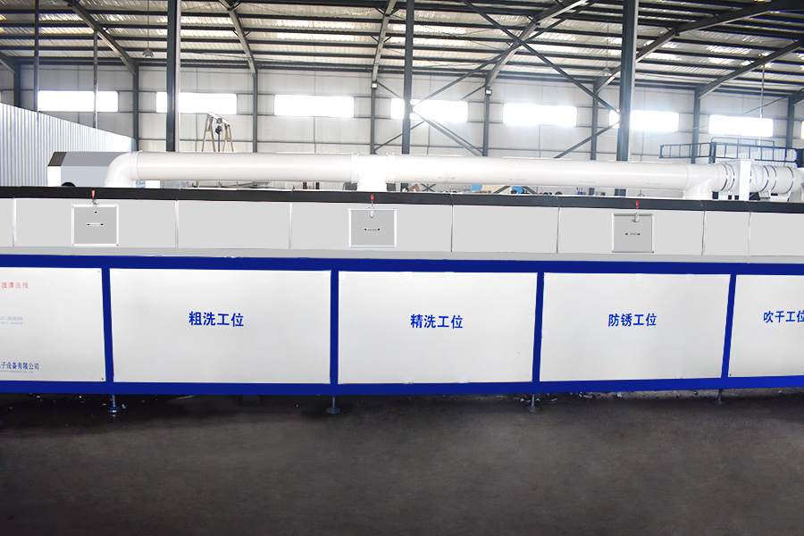 該設備有上下料網帶、超聲波清洗工位、噴淋漂洗工位、高壓風切、熱風烘干工位、溫控水加熱系統、風機、溫控空氣加熱系統、移動式風刀、PLC+觸摸屏控制系統、管路系統及智能電器控制系統等組成。自動進排液和自動加溫系統完全實現了無人干預,自動運行,很大程度上降低了工人的勞動強度。先進的霧氣處理系統可以將清洗時產生的霧氣冷凝回流,空氣經過濾和活性炭吸附后排出。