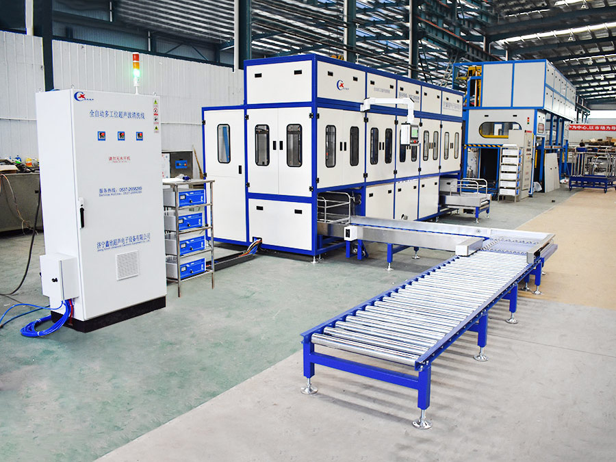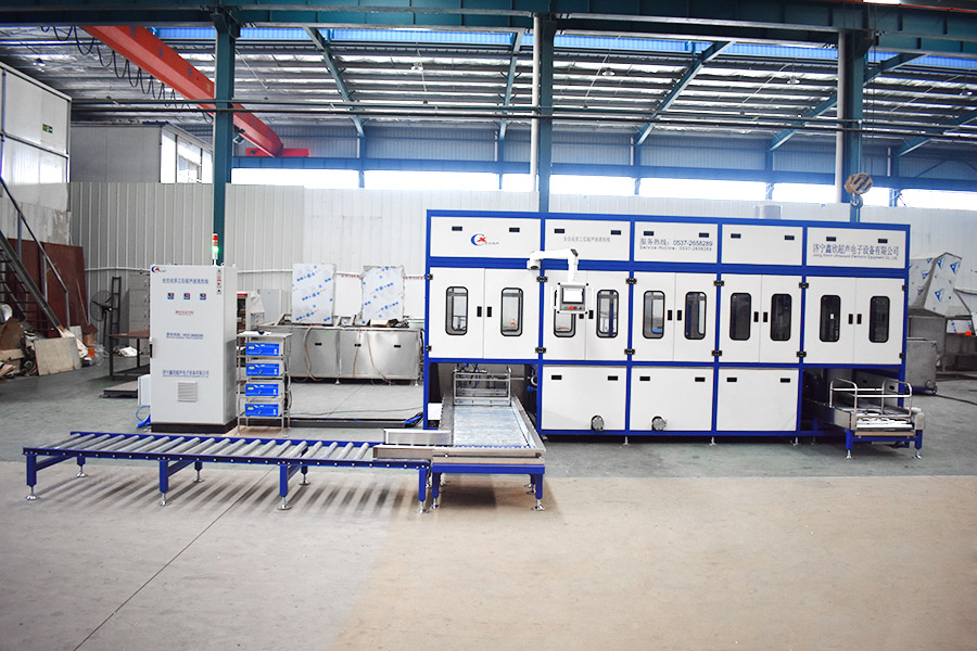 該設備有自動上下料及轉角系統、超聲波清洗系統,自動拋動、自動溢流和油污分離裝置,噴淋系統、自動高壓切水系統、自動烘干系統。機械手自動輸送系統采用高精度直線導軌配合高精度位置檢測傳感器,機械手可以準確的實現工件的抓取和放置。自動進排液和自動加溫系統完全實現了無人干預,自動運行,很大程度上降低了工人的勞動強度。先進的霧氣處理系統可以將清洗時產生的霧氣冷凝回流,空氣經過濾和活性炭吸附后排出。
