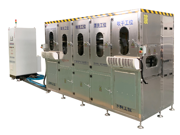 該設(shè)備有自動(dòng)上下料及轉(zhuǎn)角系統(tǒng)、超聲波清洗系統(tǒng),自動(dòng)拋動(dòng)、自動(dòng)溢流和油污分離裝置,浸泡系統(tǒng)、鼓泡系統(tǒng)、超聲波清洗系統(tǒng),下料風(fēng)切系統(tǒng)。機(jī)械手自動(dòng)輸送系統(tǒng)采用高精度直線導(dǎo)軌配合高精度位置檢測(cè)傳感器,機(jī)械手可以準(zhǔn)確的實(shí)現(xiàn)工件的抓取和放置。自動(dòng)進(jìn)排液和自動(dòng)加溫系統(tǒng)完全實(shí)現(xiàn)了無人干預(yù),自動(dòng)運(yùn)行,很大程度上降低了工人的勞動(dòng)強(qiáng)度。先進(jìn)的霧氣處理系統(tǒng)可以將清洗時(shí)產(chǎn)生的霧氣冷凝回流,空氣經(jīng)過濾和活性炭吸附后排出。