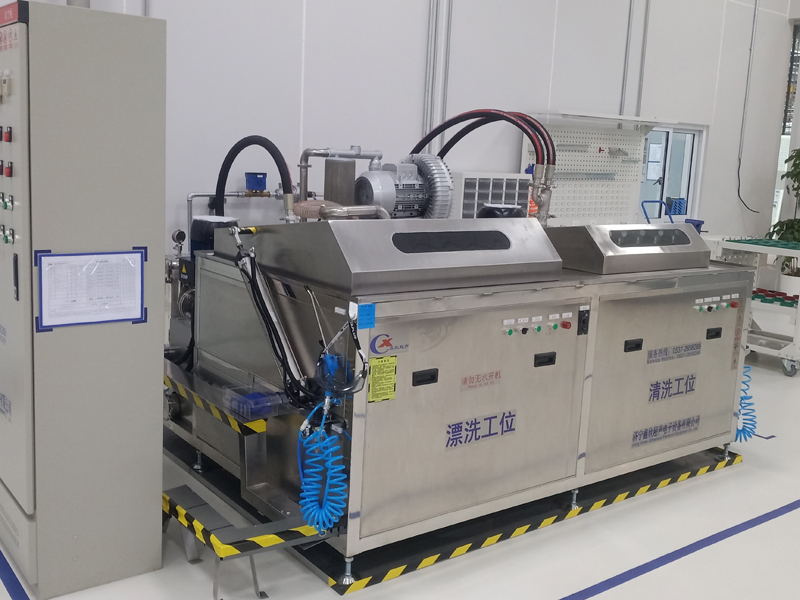 清洗設備包含兩個水平的工位,噴淋超聲波清洗工位、旋轉漂洗吹干工位,每個工位均配置人工吹掃氣槍。工藝流程:人工上料→噴淋+超聲波清洗→旋轉噴淋漂洗+吹干→人工吊出料框